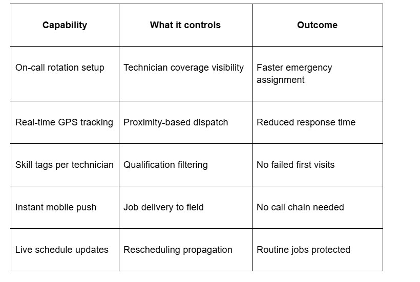 When on-call rotation is visible inside the dispatch system, the first responder is identified in seconds. A dispatcher handling a 3am emergency doesn't search a shared spreadsheet or scroll through contacts – the system shows who is on call, where they are, and whether they're already on a job. That visibility is what separates a coverage model from a coverage assumption.