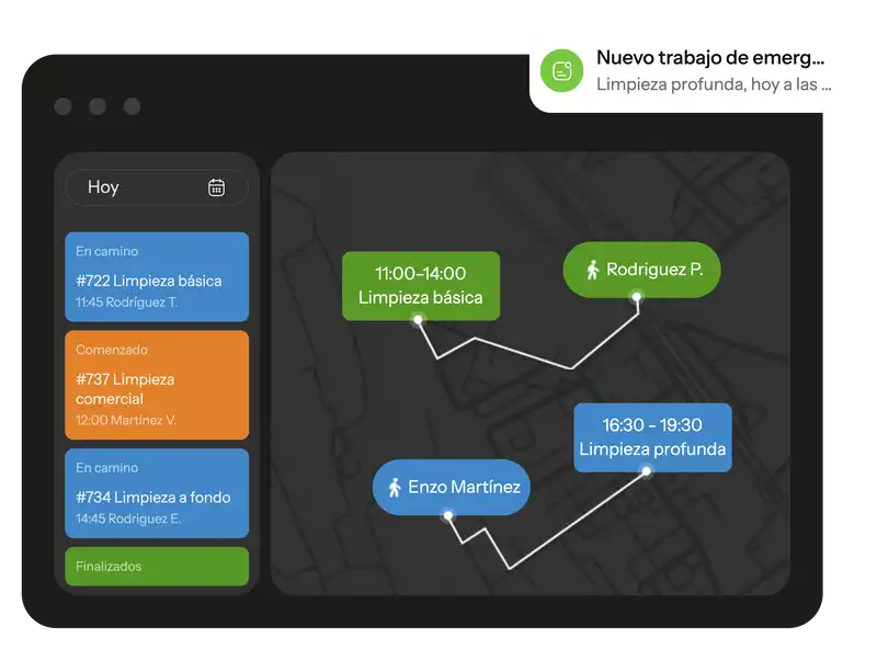 Siga el viaje de sus trabajadores durante las horas de trabajo y programe los trabajos basándose en su ubicación directamente en el mapa.