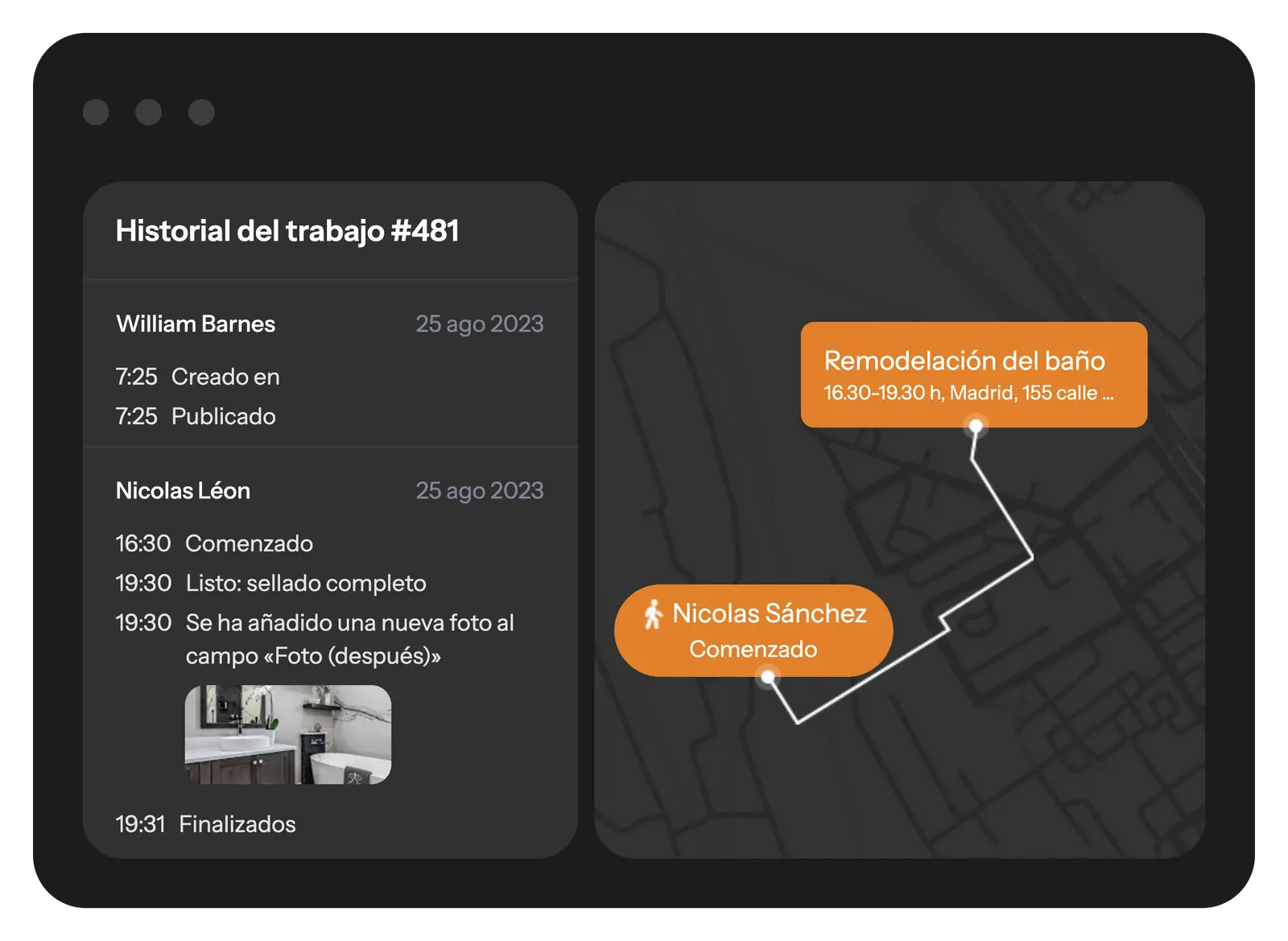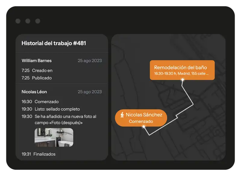 Cuando se completa una tarea, el trabajador rellena un informe personalizable con fotos y otros campos que se guarda automáticamente en la base de datos y se transmite a la oficina.