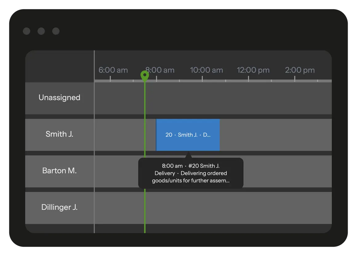 A job can be moved along the timeline, handed over to another technician, or shifted to a different time window with a simple drag. If someone finishes earlier than expected, the dispatcher can fill that gap with nearby work and publish the update. Technicians see the change right away, without calls, messages, or confusion.
