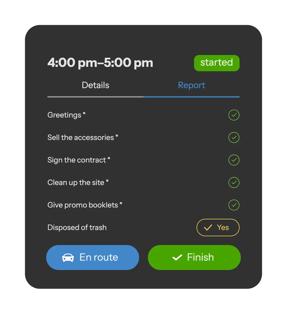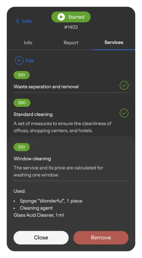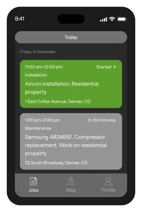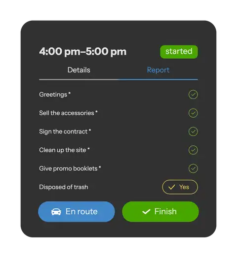 Ensure you mark each action as completed in the app. This enables the dispatcher to immediately know your status: whether you are en route to the client's premises, have started working, or have completed the job. This ensures constant communication between you and the office, allowing for more efficient organization of your work.