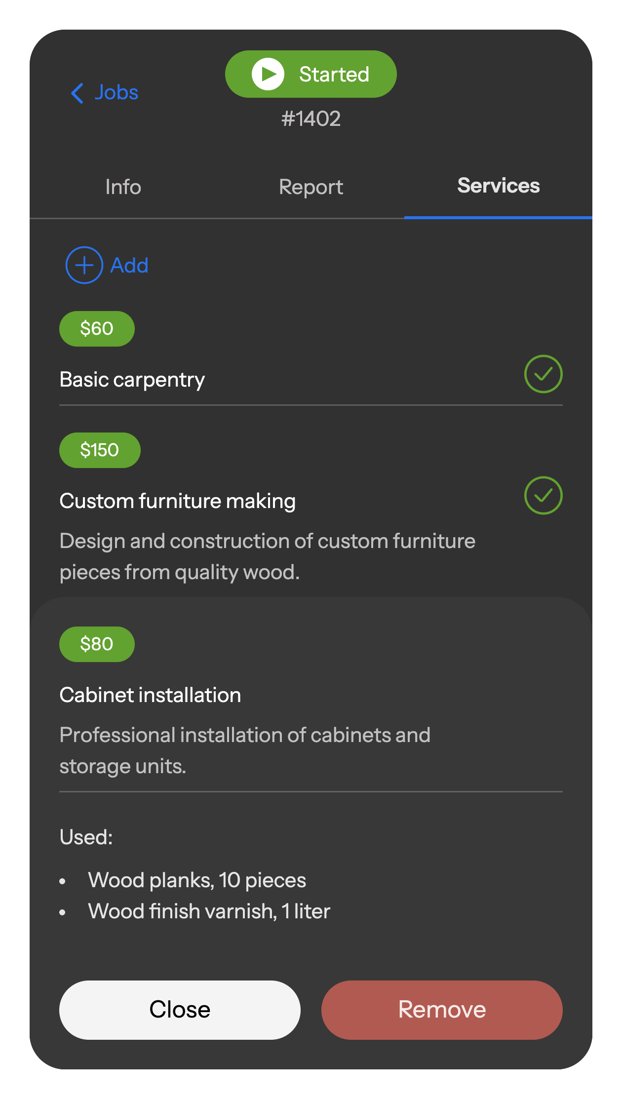 Good carpenter business software focuses on the everyday things that normally slip through the cracks. Installers can check tasks, mark progress, and drop quick photos or notes straight from the site. Carpenter software keeps templates within reach, so repeat jobs take less time to set up, and crews always know what the next step looks like. Materials, stages, and timing details stay linked to the job instead of floating around in separate chats, which helps everyone keep the pacing right throughout the week.