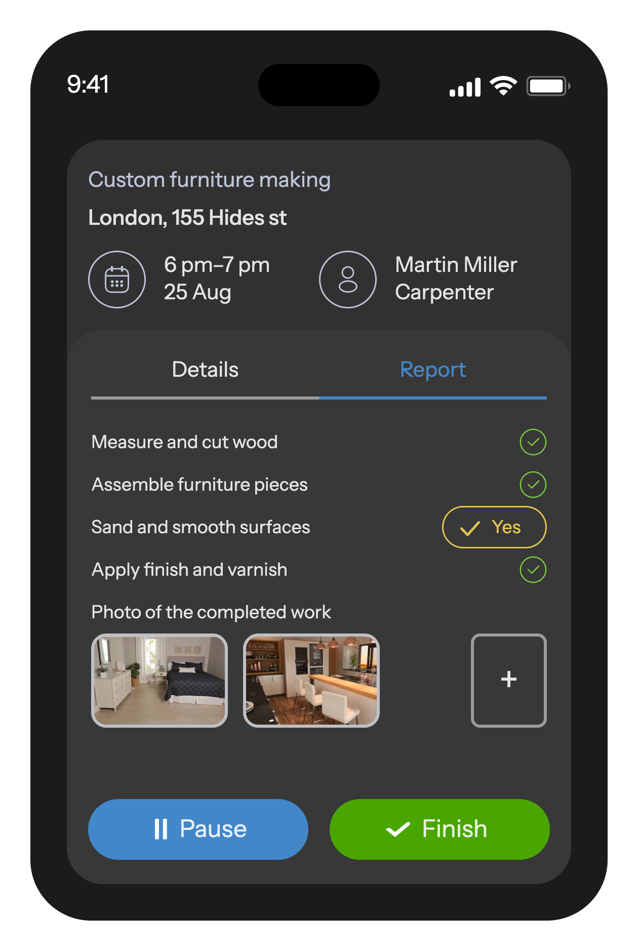 When much of the work happens on the move, software for carpenters has to fit naturally into the day – not slow it down. Mobile access lets installers open their task list the moment they reach the site, check measurements or notes from earlier visits, and add new photos without switching between apps. The updates flow back to the office in seconds, which means the supervisor sees progress as it happens instead of waiting for end-of-day messages. With carpenter software in place, small details stop slipping through the cracks, and crews spend less time coordinating and more time building.