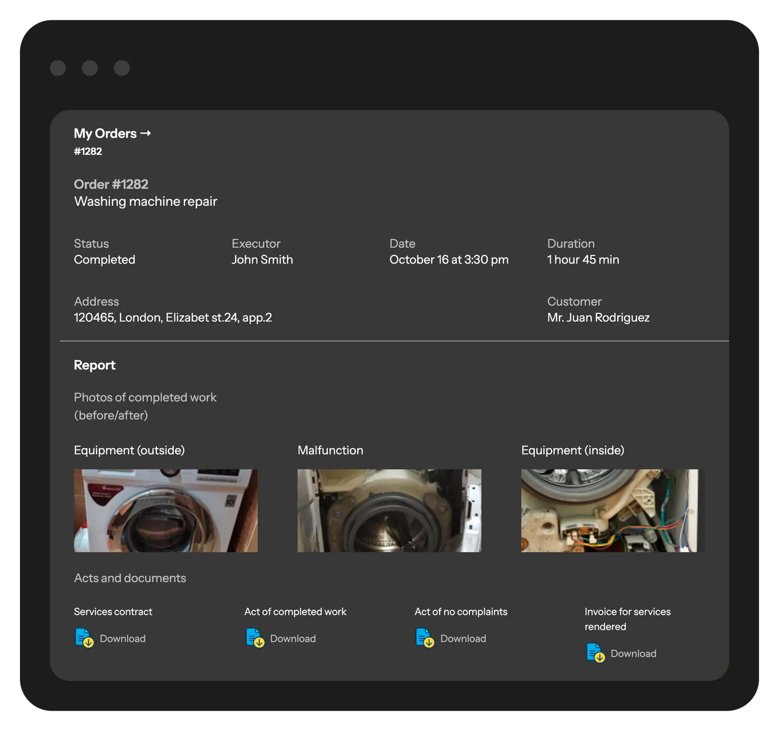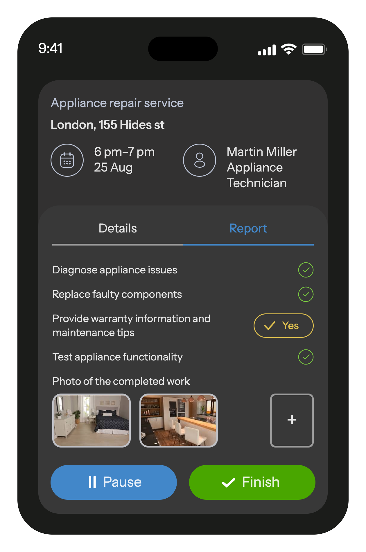 Clients automatically receive SMS or push notifications at every stage: order received, technician en route, job started, job completed. You can also send branded reports with photos and signatures for added transparency.