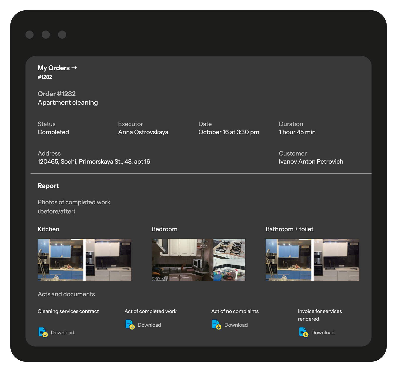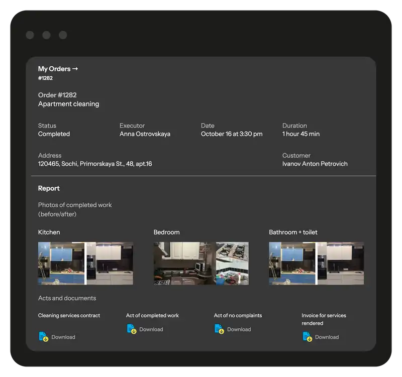 Give your customers access to a branded page with complete information about repair and service requests, work stages, photo reports, and technical documentation. Through the customer portal, your customers can track the status of their requests, view completed and planned work, and leave feedback on the quality of service. You decide which requests, objects, and details will be available for the customer to view.