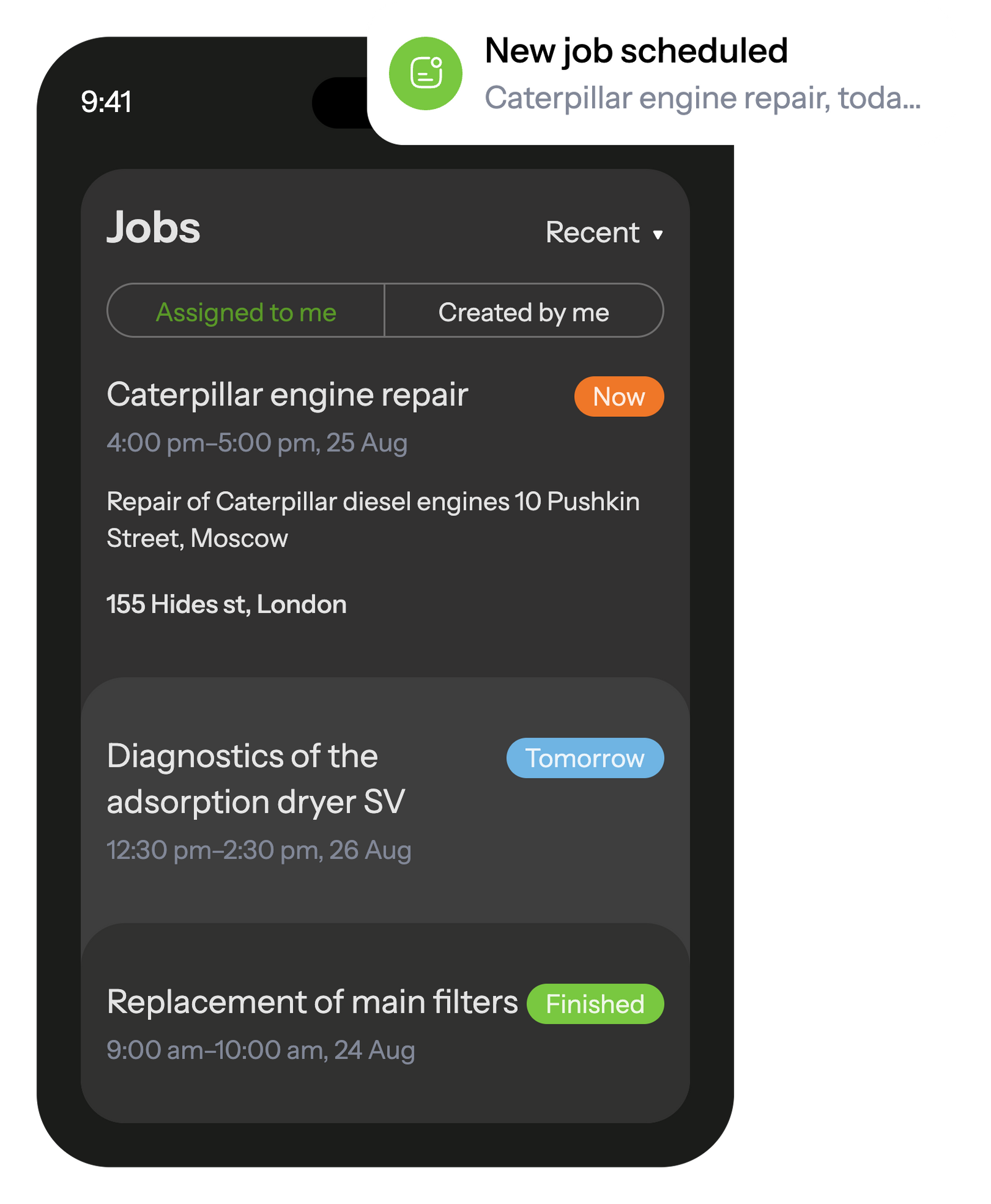 In the mobile app, employees can see information about scheduled work and receive notifications about new tasks.