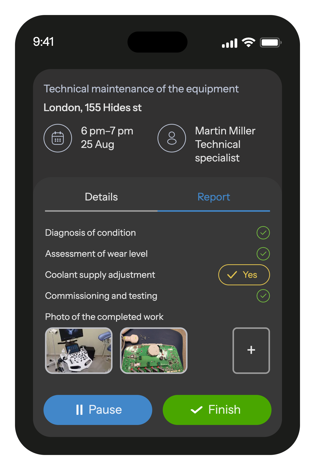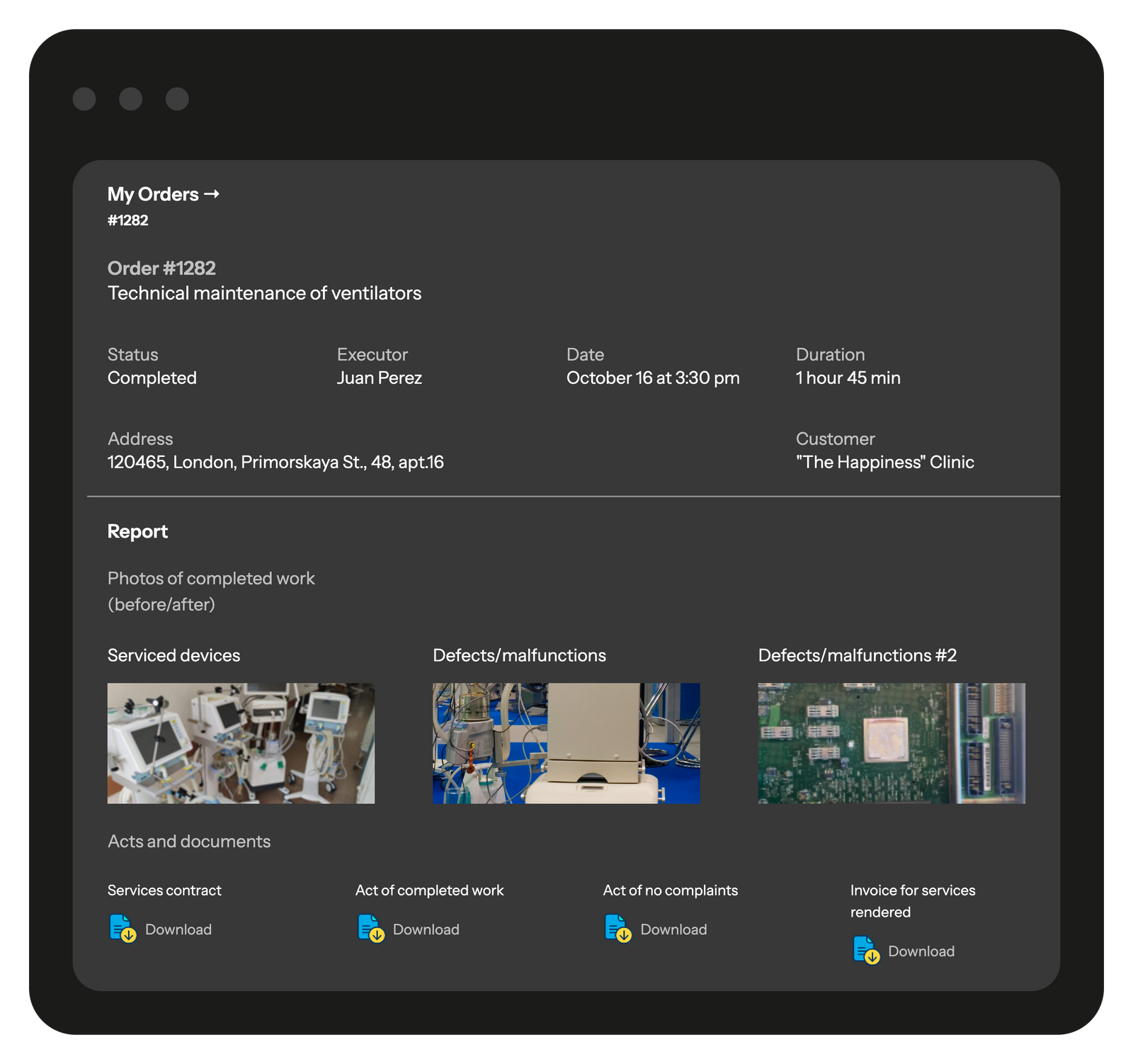 Give your customers access to a branded page with complete information about repair and service requests, work stages, photo reports, and technical documentation. Through the customer portal, your customers can track the status of their requests, view completed and planned work, and leave feedback on the quality of service. You decide which requests, objects, and details will be available for the customer to view.