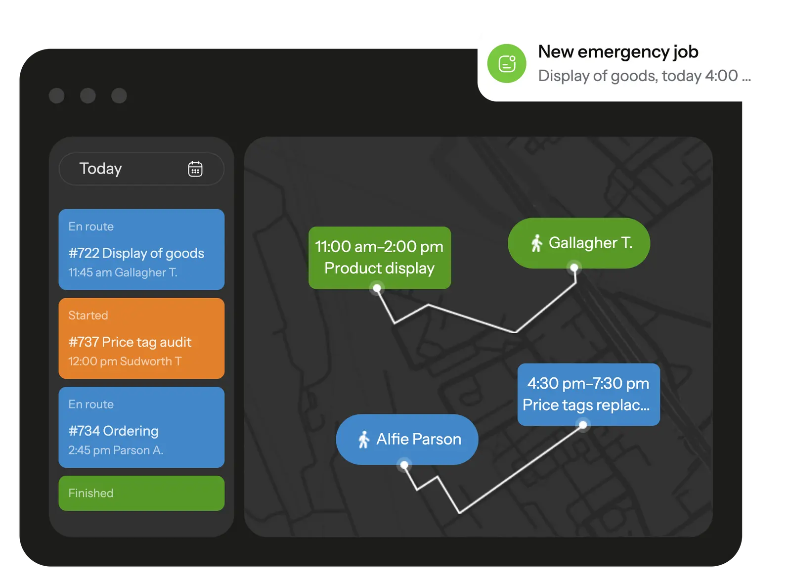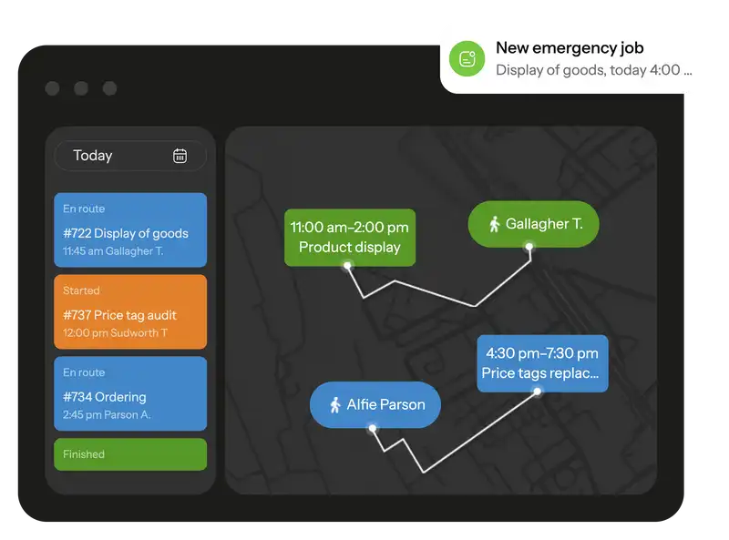 Track employee movements in real time and assign tasks instantly based on location. The system logs every visit and route, ready for review anytime.