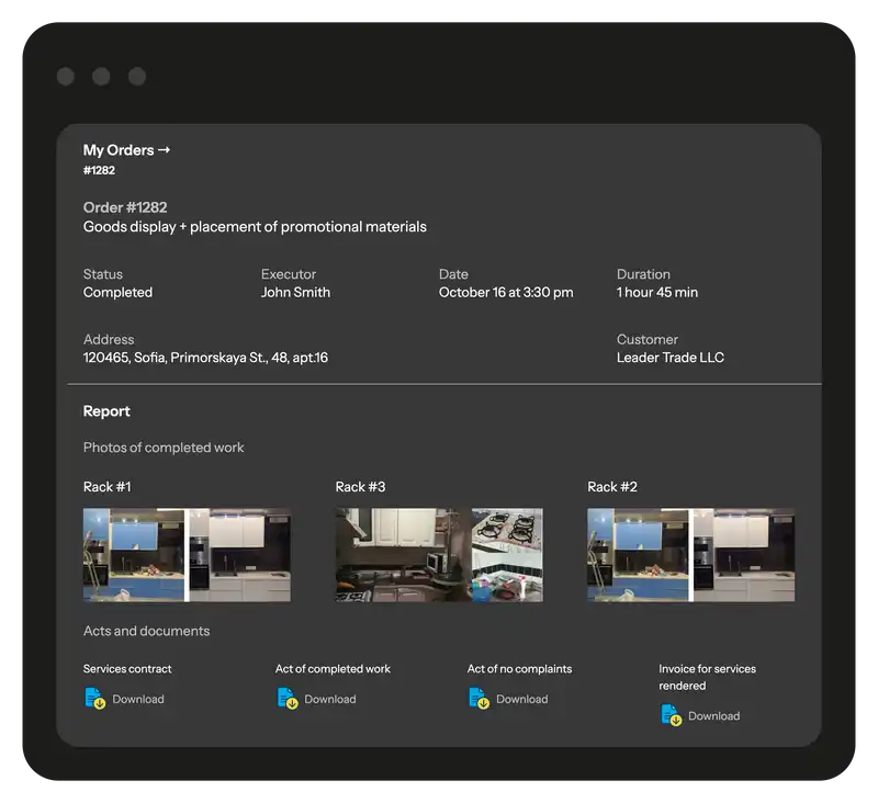 Give clients a branded portal with real-time product displays, visit history, and photo reports. They can track past and upcoming visits, review results anytime, and share feedback directly.