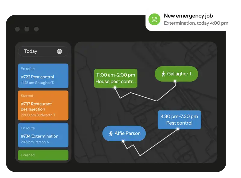 Create workflows for disinfection, pest control, rodent control, preventive visits, or emergency jobs. Add mandatory steps, photo reports, and control points.