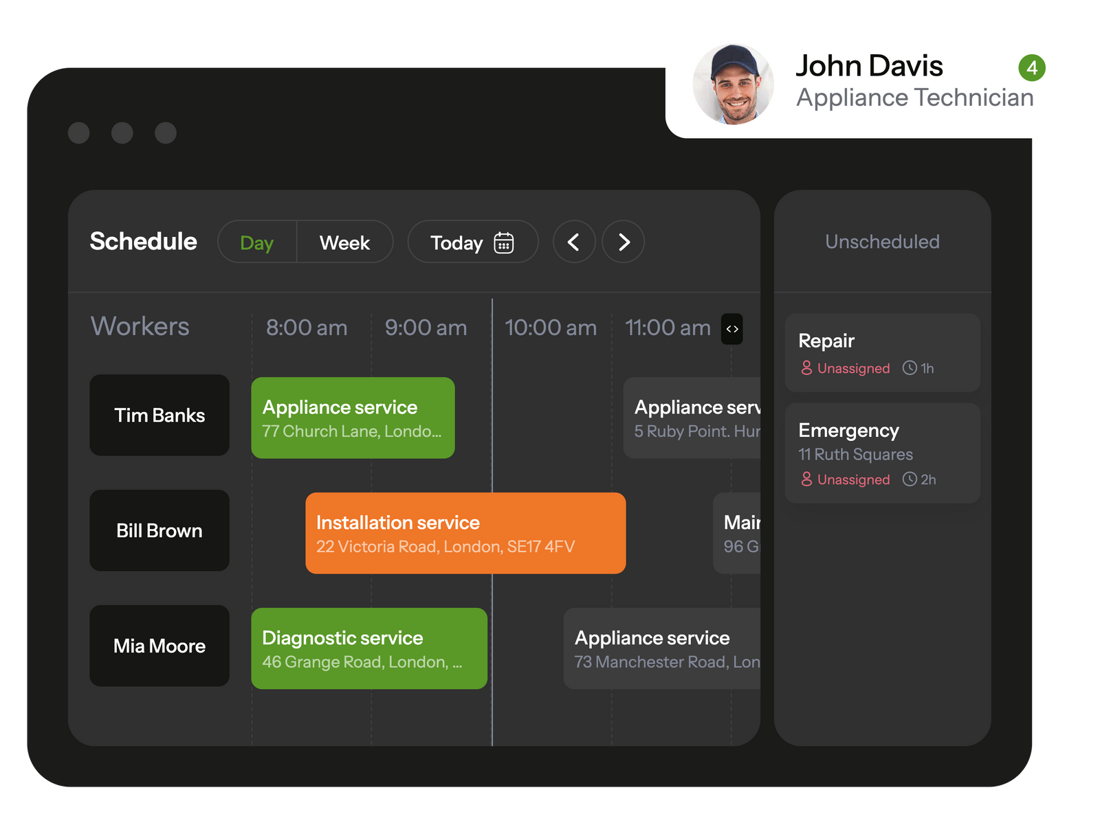 GPS location tracking helps calculate mileage and assign the closest worker to an urgent job.