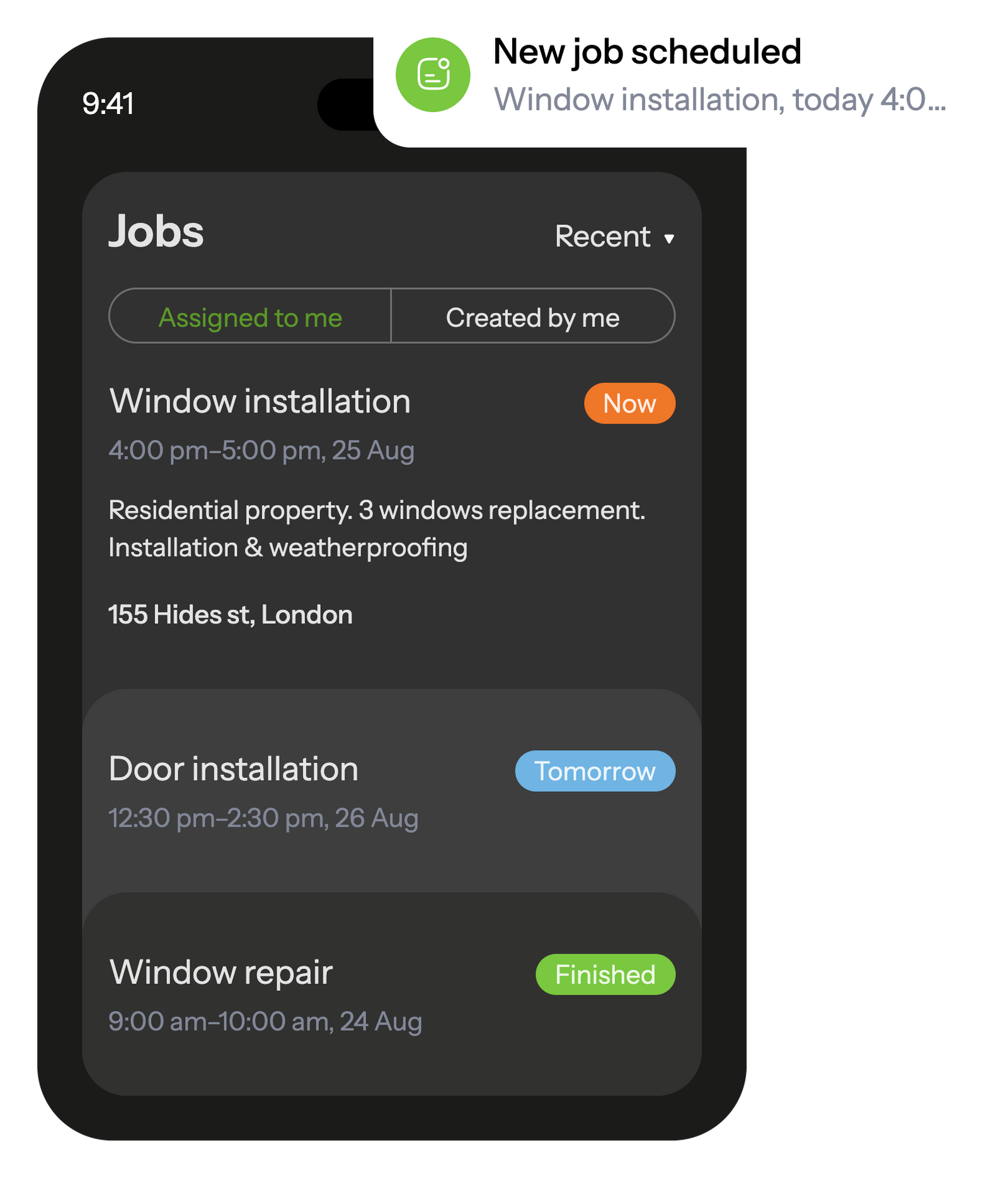 Installers get assignments with all details — including measurements from the first visit. Once the job is done, the final report syncs instantly to the office and stays available anytime.